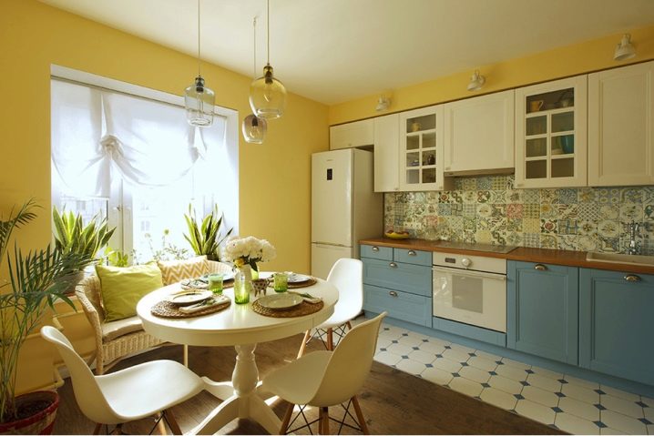 Жълтият цвят във всякакви нюанси винаги ще изглежда изгодно в интериора на кухнята. Яркото и богато жълто е подходящо за модерни интериорни стилове. Тъмните нюанси на жълто, например със средни цветя и шарки, са идеални за класически интериор или кънтри и Прованс.