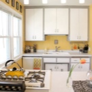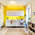 Комбинацията от бял или сив кухненски комплект с жълти мебели ще бъде много полезна, ако имате само една жълта стена или жълта кухненска престилка.