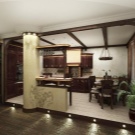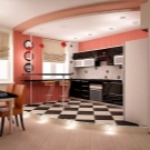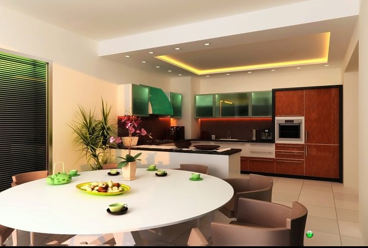 По -малко, по -ниско ниво на тавана е инсталирано над работната зона. Преходът може да бъде прав, леко извит или дори вълнообразен. Вътре често се вграждат 3-4 малки LED или флуоресцентни лампи. Таванът над основната и работната зона може да бъде боядисан в различни цветове или да се използват различни тапети. Тогава преходът ще бъде по -контрастен.