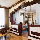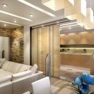 Прекрасно зониране в няколко функционални зони с таван на две нива, асиметрична арка и стъклена преграда. В същото време все още има просторно свободно пространство..