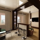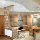 Разделянето на бар брояча е възможно между кухнята и хола, ако са разположени в непосредствена близост до апартамента. В същото време съществуващите отвори се демонтират, а в тавана се издига нова стилна конструкция. Тя може да бъде с малка височина с плот за маса и отворен проход от стая в стая. Или можете да разделите кухнята и всекидневната с стена от гипсокартон, в която е предвиден фигурен отвор за бар прозорец. Простата обработка и монтаж на листове от гипсокартон и алуминиеви профили ви позволява да направите наистина уникален проект, който да зарадва членовете на семейството за дълго време.
