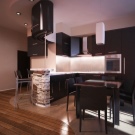 Добре е да оборудвате бар брояча с осветление на горно място. За широк отвор от 1,5-3 м са достатъчни 3-4 малки лампи, интериорът веднага се трансформира забележително. За да ги изключите, можете да използвате сензори за докосване, това ефективно ще консумира електричество.