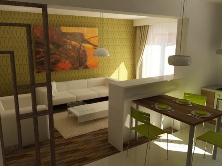 По -проста опция с централно разположение на мебелите е бар брояч за зониране. От едната му страна има работна зона, печка, хладилник, а от другата – кът за сядане със столове или диван. Тогава е удобно да сервирате напитки от кухнята през плота за чинии, а интериорът като цяло ще изглежда много впечатляващ. Можете да направите подобен дизайн със собствените си ръце или да закупите готови елегантни модели.