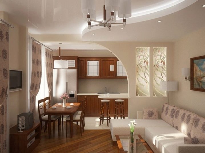 В широки отвори между кухнята и хола обикновено се правят сложни дизайни на арки от асиметрични фигури. Те могат да имат няколко нива и преходи, а практичните ниши, рафтове и декоративни елементи често се монтират отстрани. По стените на такива арки са разположени ключове, контакти, термометри и друго вградено оборудване. Вътре в нишите за гипсокартон е удобно да се подреди окабеляване за електрически и разпределителни машини.