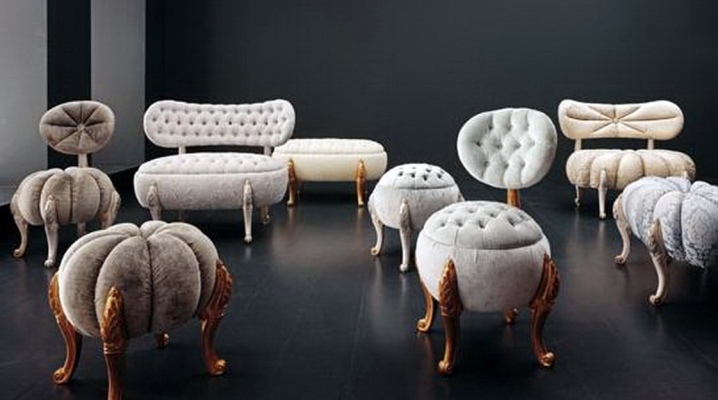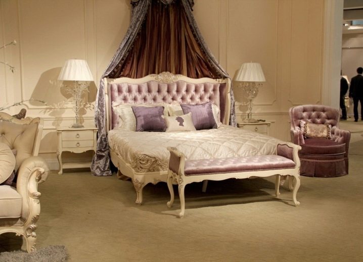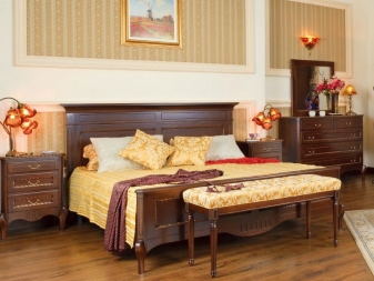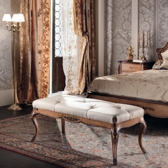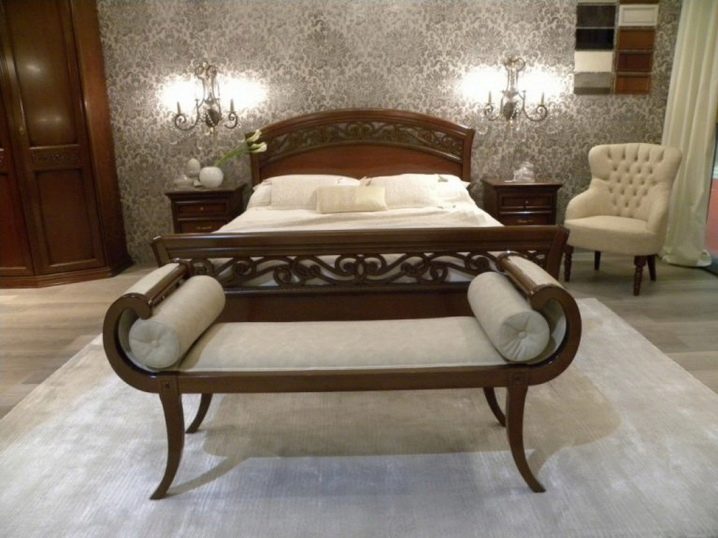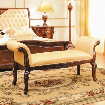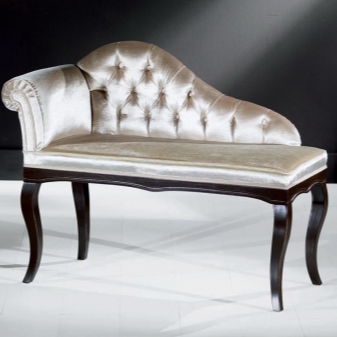Такива продукти са доста удобни и удобни. Обикновено такива мебели имат класически дизайн, опростена форма, издълбани крака, заоблени подлакътници. Има опции с мека седалка и облегалка, както и метал или дърво. Кадифе или лен се използват често като тапицерия. Продуктът е украсен със стилни грациозни шарки. Мястото може да бъде зона близо до леглото или далеч от него. Всичко ще зависи от площта на стаята, от стиловата концепция, както и от размера на самия банкет..
