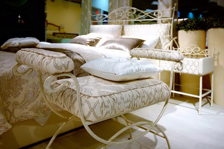 - Пейка от ковано желязо. Обикновено такива модели се правят по поръчка. Има обаче и магазини, които предлагат на клиентите подобни продукти. Цената на такъв продукт обикновено е доста висока. Благодарение на художественото коване можете да превърнете най -креативните идеи в реалност, да създадете интересни елементи, оригинални детайли. Това може да бъде обикновена пейка, която може успешно да бъде прикрепена към леглото. Обикновено под седалката има рафт, където можете да поставите всякакви неща. Има грациозни опции с гръб. Седалките могат да бъдат тапицирани с плат. Такива продукти ще бъдат чудесно допълнение към вашия интериор..