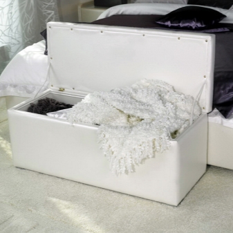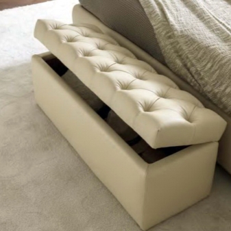 Тази опция е и една от най -често срещаните. Такъв продукт успешно ще украси спалня. Основните предимства на този модел включват факта, че той има повдигаща седалка, където има просторно чекмедже. Често такива продукти са тапицирани с кожа, изкуствена кожа или плътна тъкан. В такъв банкет можете да съхранявате най -различни неща..