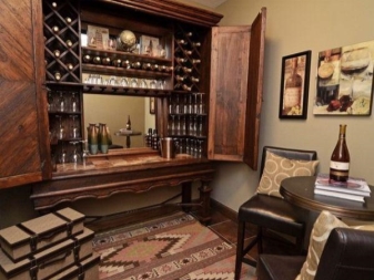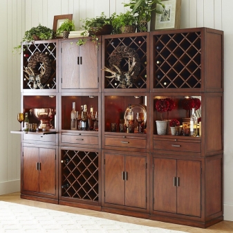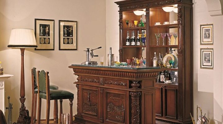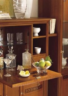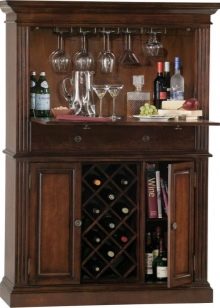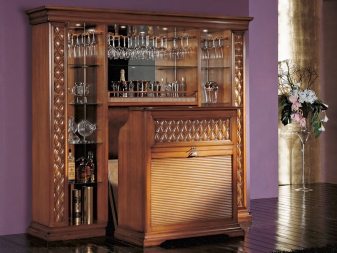 Плюсовете включват разнообразието в дизайна. Дърворезбата ви позволява да създавате наистина красиви шарки по вратите и основата на конструкцията. Шкафът за съхранение на алкохол може да се продава в комплект с допълнителни елементи. Например с бар брояч, който ще ви позволи да създадете малък уютен бар точно в хола си.