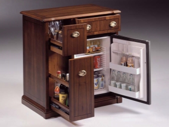 Голям плюс за мнозина е наличието на хладилно отделение. Това е удобно: ако планирате да пиете нещо, което обикновено се сервира студено, можете да донесете напитката до желаната температура точно в бар шкафа. По правило в такива структури можете независимо да регулирате температурния режим. Освен това можете да поставите не само алкохол в хладилника, но и някои закуски..