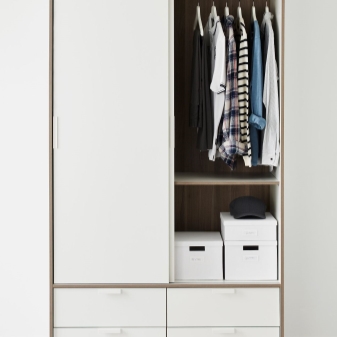 - Понякога продуктите комбинират отделения с врати и чекмеджета на панти. Такива шкафове са малки и компактни, но в същото време могат да държат доста дрехи..