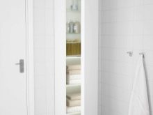- Подобни дизайни се използват в банята. Вътре те са оборудвани с хоризонтални рафтове за удобно съхранение на малки предмети. Понякога вратите на висящите шкафове са прозрачни. За банята най -често се избират бели модели..