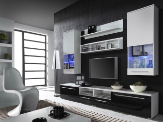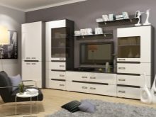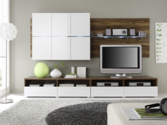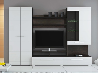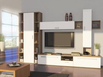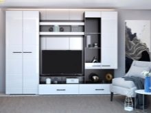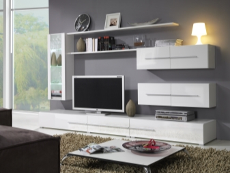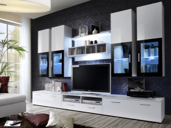Ако желаете, бял комплект може да бъде поставен и в стая с много лек дизайн. Но в този случай е по -добре да закупите черно -бял или модел, който съчетава бял и цвят венге. Такава стена няма да се слее с общата среда..