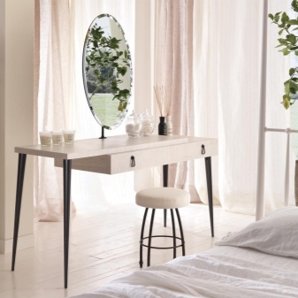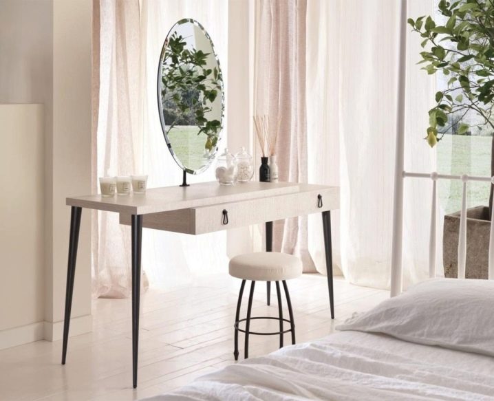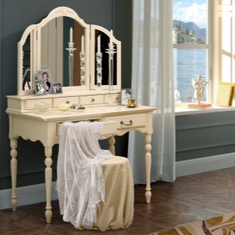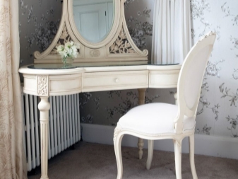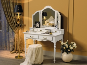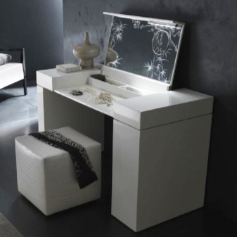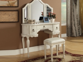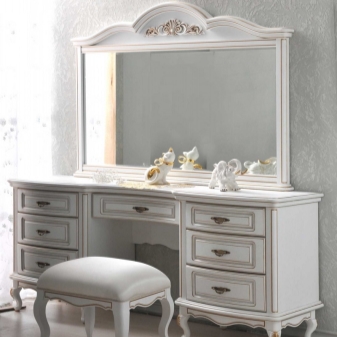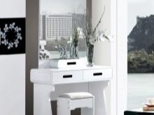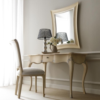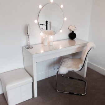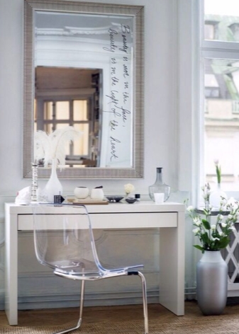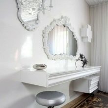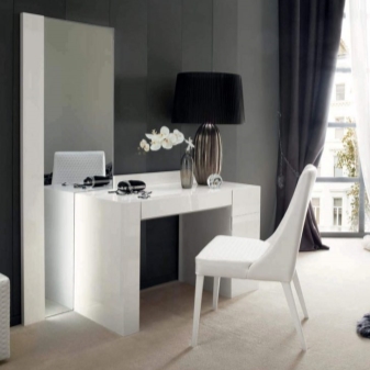 Моделите могат или не могат да имат огледало. Разбира се, бяла тоалетка с огледало е много по -удобна. Няма нужда да търсите подходящ атрибут, закачете го на стената. Поставете маса – и можете да се грижите за себе си. Този тип мебели е доста често срещан. Изработва се под формата на тоалетка или решетка.
