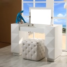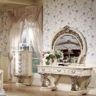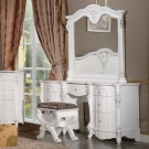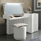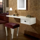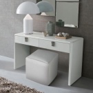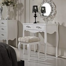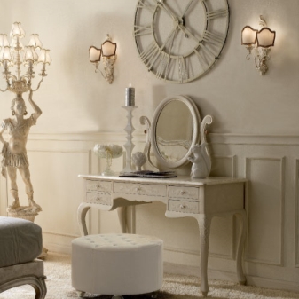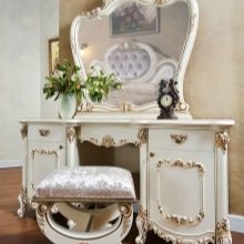 Също така появата на бели тоалетки силно зависи от стила, за който е предназначен този или онзи продукт. Така че, класика за Прованс ще бъде маса от тази цветова схема, изработена от естествено дърво. Покритието тук е за предпочитане матово.. Възможно е малко количество флорален орнамент върху крилата на вратата.