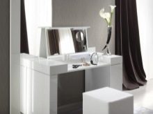 Бяла тоалетка често се използва за създаване на оригинален интериор в спалня. Ето няколко интересни идеи, проектирани от различни дизайнери за модерен интериор на спалнята. Гланцова маса със сгъваемо огледало с прости геометрични форми в спалня с графитен стил в хай-тек ще бъде не само функционална, но и ще се превърне в основния акцент, който привлича всички погледи..