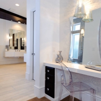 - Стил на стаята. Бяла тоалетка трябва да се вписва идеално в декора и да се превърне в акцент в интериора на вашата спалня. Може да се комбинира с останалите мебели, не само по цвят, но и по форма. Ако това ще бъде акцент в стаята, тогава той трябва да бъде подкрепен с бял текстил или няколко аксесоари от същия цвят..