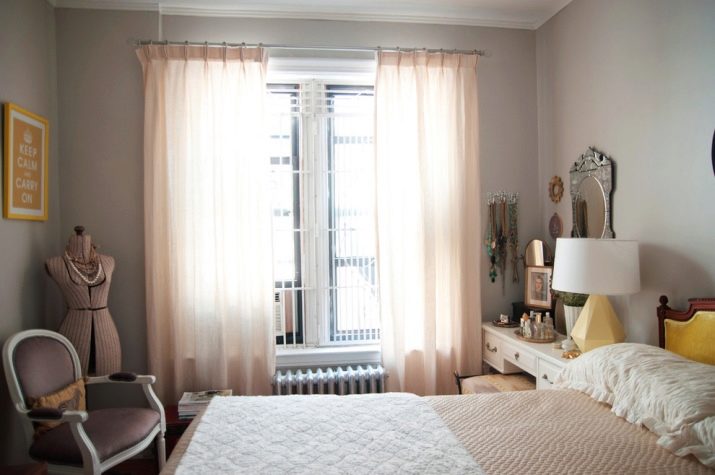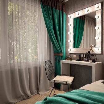 - Размер на спалнята. Размерът на вашата стая зависи не само от размера на тази мебел, но и от формата й, броя на складовите помещения. Така че за малка спалня е по -добре да изберете модели с тесен плот, където огледалото е поставено на стената. Също така доста често в малки стаи тоалетка се използва като нощно шкафче, като по този начин се комбинира функционалност. В този случай са подходящи конвертируеми мебели със сгъваемо огледало..