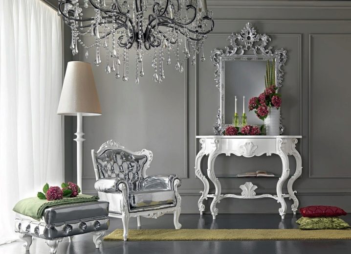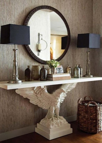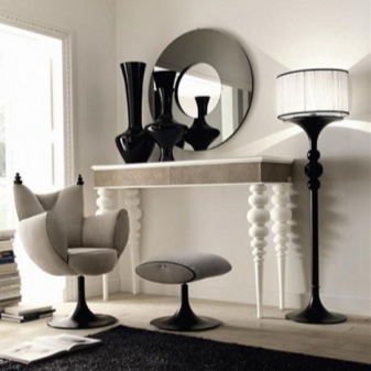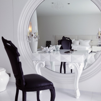 Голямо кръгло огледало от пода до тавана, украсено с аплици с кристални висулки и малка масичка с резбовани крака ще бъде оригинална декорация на интериора в стил арт деко.