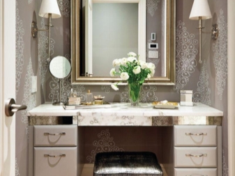 Но има недостатък на вградения огледален дизайн. Такава мебел ще заеме значително пространство, докато отделна маса и висящо огледало ще ви помогнат да не заемате допълнителни квадратни метра.