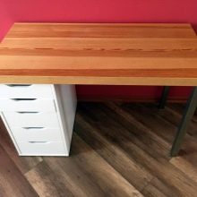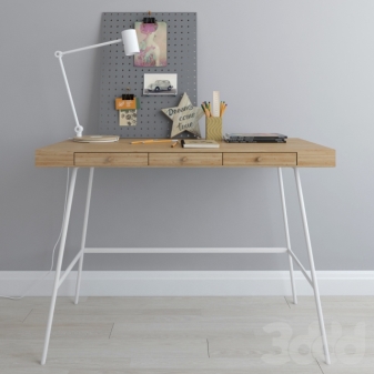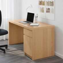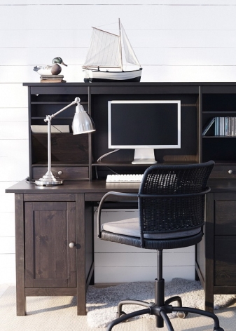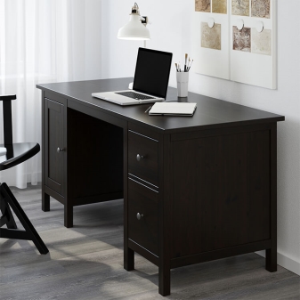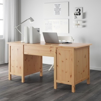 - “Хемнес”. Това е продукт с 2 нощни шкафчета и рафт, поставен под плота. Изработен изцяло от масивен бор. Долното чекмедже има регулируема рамка за държане на хартия. Задният панел и предният панел са завършени с масивно дърво, така че масата може да бъде монтирана в центъра на стаята. Задните имат отвори за осигуряване на достъп на въздух до системния блок на компютъра.