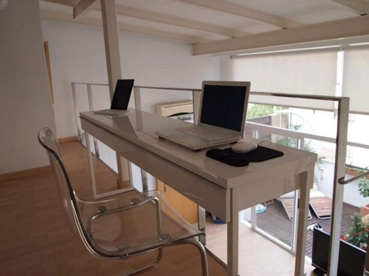 - Стъкло или плексиглас, комбинирани с метални детайли. Работните маси, изработени от добро стъкло, се вписват идеално в съвременния интериор