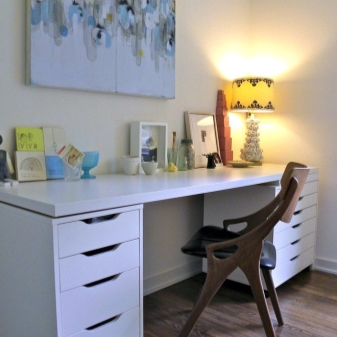 - В магазините на Ikea маси с рафтове или функционални чекмеджета се предлагат в огромен брой. Това могат да бъдат вградени чекмеджета с изтеглящ се тип, монтирани под работната повърхност, и отворени чекмеджета като стелаж, както и различни вградени рафтове. Полезни модулни рафтове често се добавят към бюро с домашни чекмеджета.