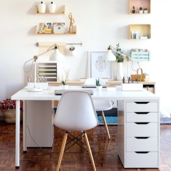 - Размерът на плота на масата трябва да бъде такъв, че човек да може спокойно да седи тук и в същото време все още има много място за учебници или документи, различни аксесоари и настолна лампа. Когато търсите маса за двама, трябва да изберете най -оптималния размер на плота за такъв случай..