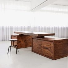 - За офис бюра Факторът на функционалност е по -важен, когато „всичко е под ръка“. Тези маси са направени от по -евтини видове дърво. Структурно те могат да бъдат изпълнени в различни форми, например ъглови маси, под формата на буквата “g” или “p”, което отново се определя от тяхната функционалност и характеристиките на разположението на всеки продукт. Често такива маси имат допълнителни мебели – различни ниши, място за компютър, настолни и подови кутии, рафтове. Основата за производството на този тип бюра за писане са по -евтините видове дървесина, например бор. Дизайнът на продукта, като правило, е бизнес, лаконичен, с последователна цветова схема..