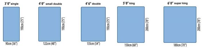 - Американски – малък двоен (122 x 190), пълен (137,2 x 190), кралица (154,2 x 203,2).