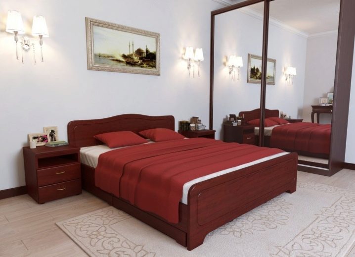 - Легло тъмен цвят ще направи стаята малко по -монументална и в същото време елегантна. Необходимо е внимателно да изберете останалите интериорни предмети за него, за да не унищожите целия чар. Леглото, боядисано в “орех”, ще добави лукс към обзавеждането, винаги с подходящи мебели.