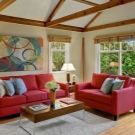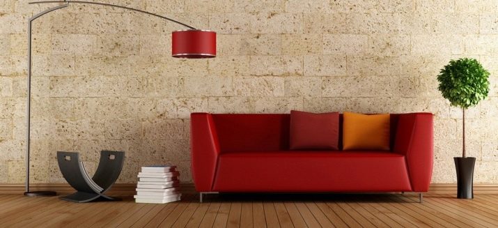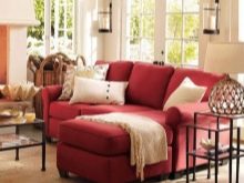 Стая за приемане на приятели и релакс със семейството често се прави в спокойни, топли цветове: пясък, бежов, корал. Червен диван украсява такива стаи и ги прави по -луксозни. За да се впише идеално в интериора на избрания стил, можете да вземете други предмети за него: саксии за цветя, рамки за снимки, аплици, подови лампи и други продукти от същия нюанс..