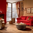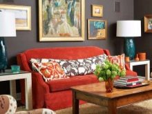 Красиво, без агресия, червеното изглежда с кафяво. За класически стил, забележителна комбинация от червен диван и мебели от естествено дърво ще бъде идеален вариант..