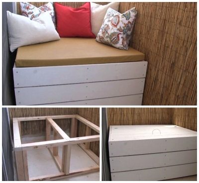 Ако вашият балкон има вдлъбнатина или вдлъбнатина от стената, можете да инсталирате дивана там. Това ще бъде така нареченият домашен вграден диван. Освен това може да не се притеснявате твърде много с дизайна. Можете буквално да напълните седалката с одеяло, да хвърлите възглавници, да украсите гърба с ПДЧ или шперплат – и това е всичко..