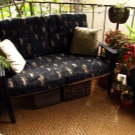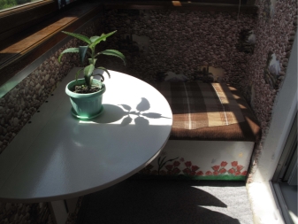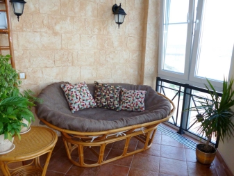 Ако нямате възможност да си купите диван, обърнете внимание на магазините. Те задължително трябва да са с гръб, а не с най -малкия размер. Да, разбира се, пейките могат да бъдат груби, но е достатъчно просто да ги обшиете с плътна мека кърпа и да ги поставите с възглавници. Тази опция е подходяща и за плетени дивани. Те могат да бъдат оставени в оригиналния си вид, тъй като ракитата е доста креативно решение за балкона. Можете да поставите възглавници и цветно одеяло.