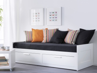 В компанията Ikea за 10 хиляди рубли можете да намерите диван с две или три чекмеджета. Това е моделът Brimnes в бяло. Размерът е съвсем стандартен: 205 × 86 × 57 см. Матракът 200 х 80 см е подходящ за тези мебели. Цветното спално бельо може да се контрастира с бялата рамка.