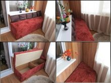 Диванът за балкона е най -добре да бъде поръчан, така че да се вписва идеално в пространството и да не го затрупва. Отличен вариант би бил двуцветен модел с тапицерия от плат. Седалката е изработена от плътен структуриран материал с червено-кафяв цвят, дъното на дивана, облегалката, както и възглавниците са изработени от сиво-зелена плътна тъкан, устойчива на замърсяване и износване. Вътре има две хоризонтални отделения за съхранение.