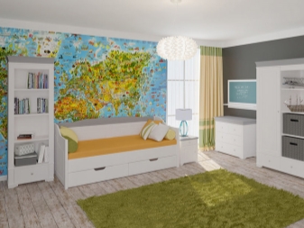 Яркост и жизненост в интериорния дизайн на детска спалня ще донесе легло-диван в светлозелен нюанс. Този модел се предлага с висок гръб, който се монтира отделно. В долната част има две чекмеджета. Те могат да бъдат в същия нюанс като гърба или да добавят още повече цвят – жълт, оранжев или син. Цената на такъв модел започва от 14 хиляди рубли.