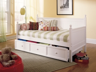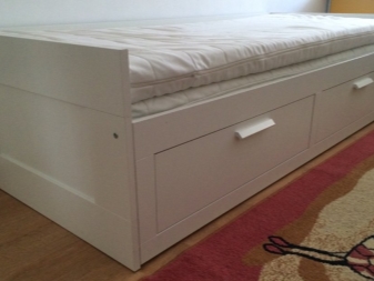 В компанията Ikea за 10 хиляди рубли можете да намерите диван с две или три чекмеджета. Това е моделът Brimnes в бяло. Размерът е съвсем стандартен: 205 × 86 × 57 см. Матракът 200 х 80 см е подходящ за тези мебели. Цветното спално бельо може да се контрастира с бялата рамка.