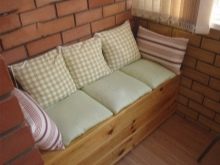 Такъв малък диван може да бъде поставен в ъгъла на балкона. Ще заема много малко място. Редица възглавници се използват вместо облегалката. Седалката се повдига, вътре има празно място за съхранение на различни неща.