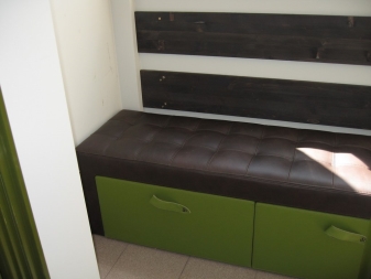Диванът за балкона е най -добре да бъде поръчан, така че да се вписва идеално в пространството и да не го затрупва. Отличен вариант би бил двуцветен модел с тапицерия от плат. Седалката е изработена от плътен структуриран материал с червено-кафяв цвят, дъното на дивана, облегалката, както и възглавниците са изработени от сиво-зелена плътна тъкан, устойчива на замърсяване и износване. Вътре има две хоризонтални отделения за съхранение.