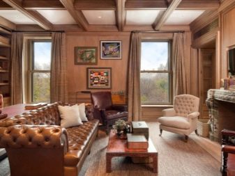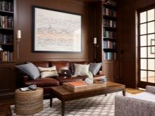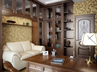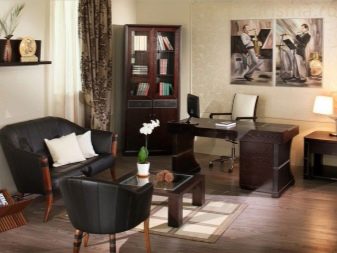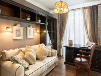 Обикновено се опитват да купуват продукти в нюанси на бежово и кафяво за офиса., избор на модели, които да съответстват на цвета на бюрото, лавицата или фотьойла. Това решение е традиционно, но в повечето случаи тъмният диван скрива осветлението на тази стая още повече..