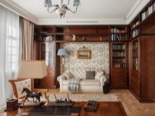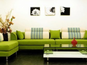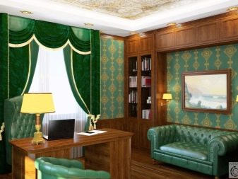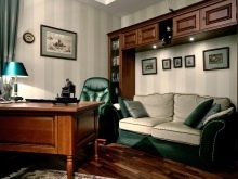 Още моделите от комбиниран тип със свалящи се облегалка и седалки изглеждат по -интересни. Така че светъл диван изглежда уютен и лек. Например, основата може да бъде тъмнозелена, а цветът на подложката е бежов, или самият диван е тапициран с шоколад, а модулните му седалки и облегалки са бледо маслинени. Подобно решение се затруднява от закупуването на подвижни покривала, но такъв диван изглежда стилно и добавя голям дял комфорт към кабинета..