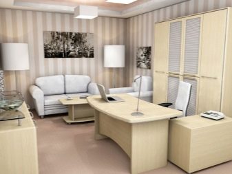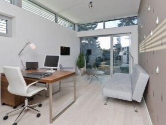В допълнение към бюро, ергономичен стол и поставка за книги или документи относно правилата за подреждане, можете да включите диван в интериора.