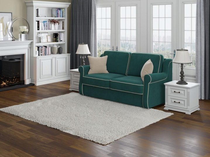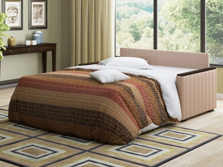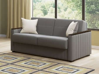 В сгънато състояние дълбочината на дивана е 110 сантиметра, а ширината на подлакътниците е 8 сантиметра.. За хол или спалня в стила на минимализма това ще бъде идеално, тъй като моделът няма излишни детайли.. Всички форми и извивки имат ясна геометрия и гладки линии. Интересно и леко допълнение са лаконичните тръбопроводи на подлакътниците и облегалката.