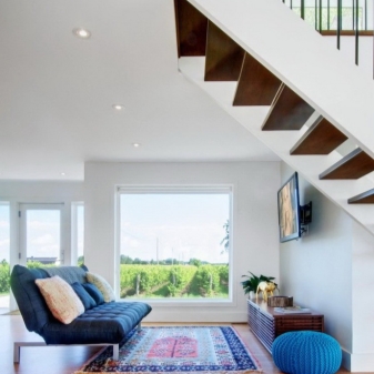 Диванът не трябва да се поставя по обичайния начин близо до една от стените. Може да стои в средата на голяма всекидневна, отделяйки трапезарията от зоната за почивка, особено когато става въпрос за студио апартамент. Разбира се, задната част на дивана с това оформление трябва да бъде покрита с тапицерия. Модулен ъглов диван перфектно зонира стаята. Разположението на дивана по отвора на прозореца също е необичайна, но интересна техника, тъй като нисък диван няма да пречи на потока от слънчева светлина, но ще остави основното пространство на стаята свободно.