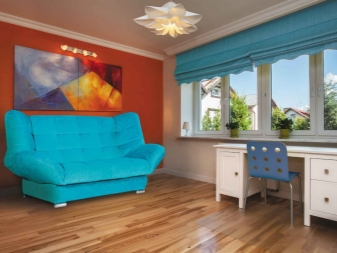 Цял комплект мебели с конструкция „Click-gag“ представени в тази стая: просторен диван и удобно кресло-легло. В стая, декорирана в спокойни пясъчни тонове, контрастен син диван изглежда страхотно. Компактен светъл диван – идеално решение за детска и тийнейджърска стая.