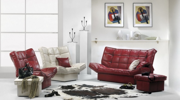 Лаконичен кожен диван с механизъм „Click-gag“ ще се превърне в звезда на интериора в стил Минимализъм. Средно голям диван в хола с ярки акценти е събрал основните цветове на тази стая в цветовата схема на нейната тапицерия..