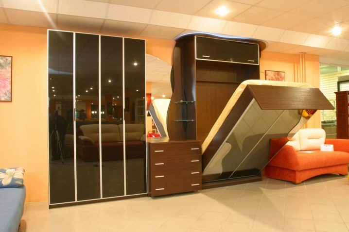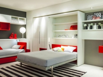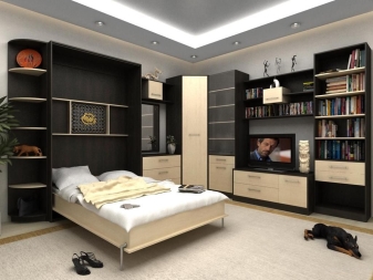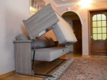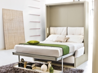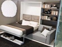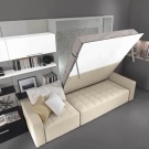 Заедно с разтегателните дивани можете да вземете стилно трансформиращо се легло. Това е класическо хоризонтално легло, което не се сгъва до стената, а се сгъва надолу. Тази опция е удобна, ако искате вашето място за спане да бъде голямо и удобно, но през деня мястото става свободно.