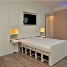 Това легло може да се монтира както в спалнята, така и в хола. Ако се издигне и се скрие в ниша, тогава няма нужда да инсталирате допълнителни части до него – пиедестали, фотьойли и скрин ще изглеждат просто нелепо, когато го повдигнете и там се образува празнота. Проектирайте интериора си така, че да съответства на способността на новото ви легло да промени обкръжението си.