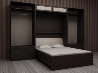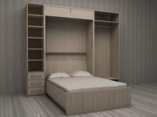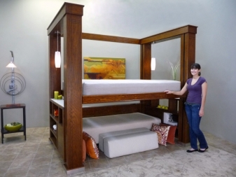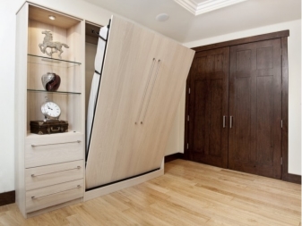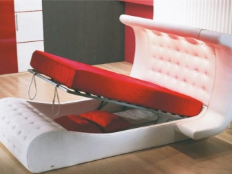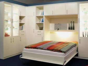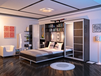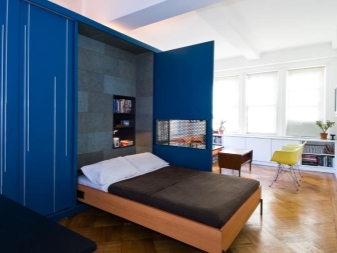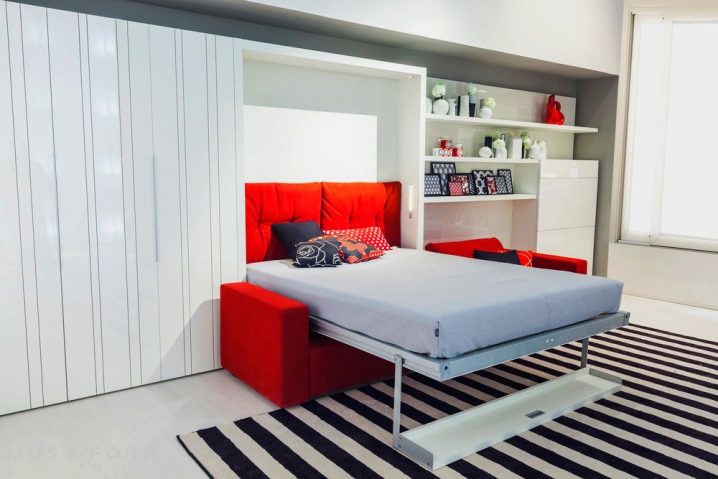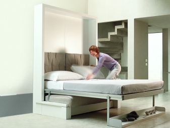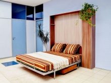 Но дизайнът изглежда наистина стилен и интересен. В нормални времена той прилича на стандартно легло, но през деня може да бъде повдигнат и скрит в специална ниша. След това ще изглежда като гардероб. Сгъването и сгъването на такъв модел е много лесно..